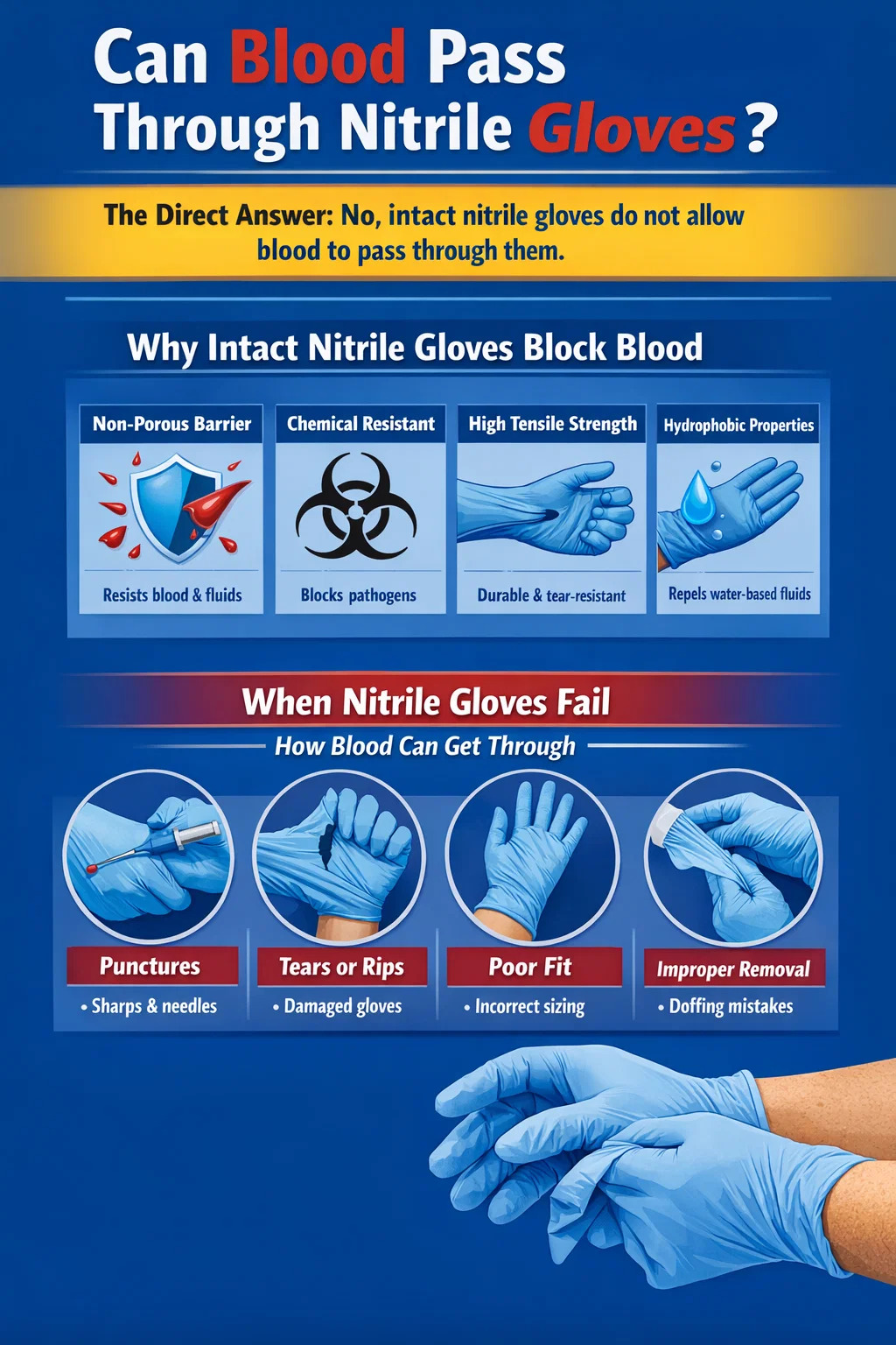 Jednakże słowo „nienaruszony” ma w tym stwierdzeniu ogromną wagę. Krew lub patogeny, które może zawierać, mogą przedostać się na skórę, jeśli rękawica zostanie rozdarta, przebita, ma niewykrytą wadę produkcyjną lub jest używana nieprawidłowo. Sam materiał rękawic nie wchłania ani nie pozwala na bierne przenikanie krwi w standardowych warunkach użytkowania, ale fizyczne naruszenia zmieniają wszystko.