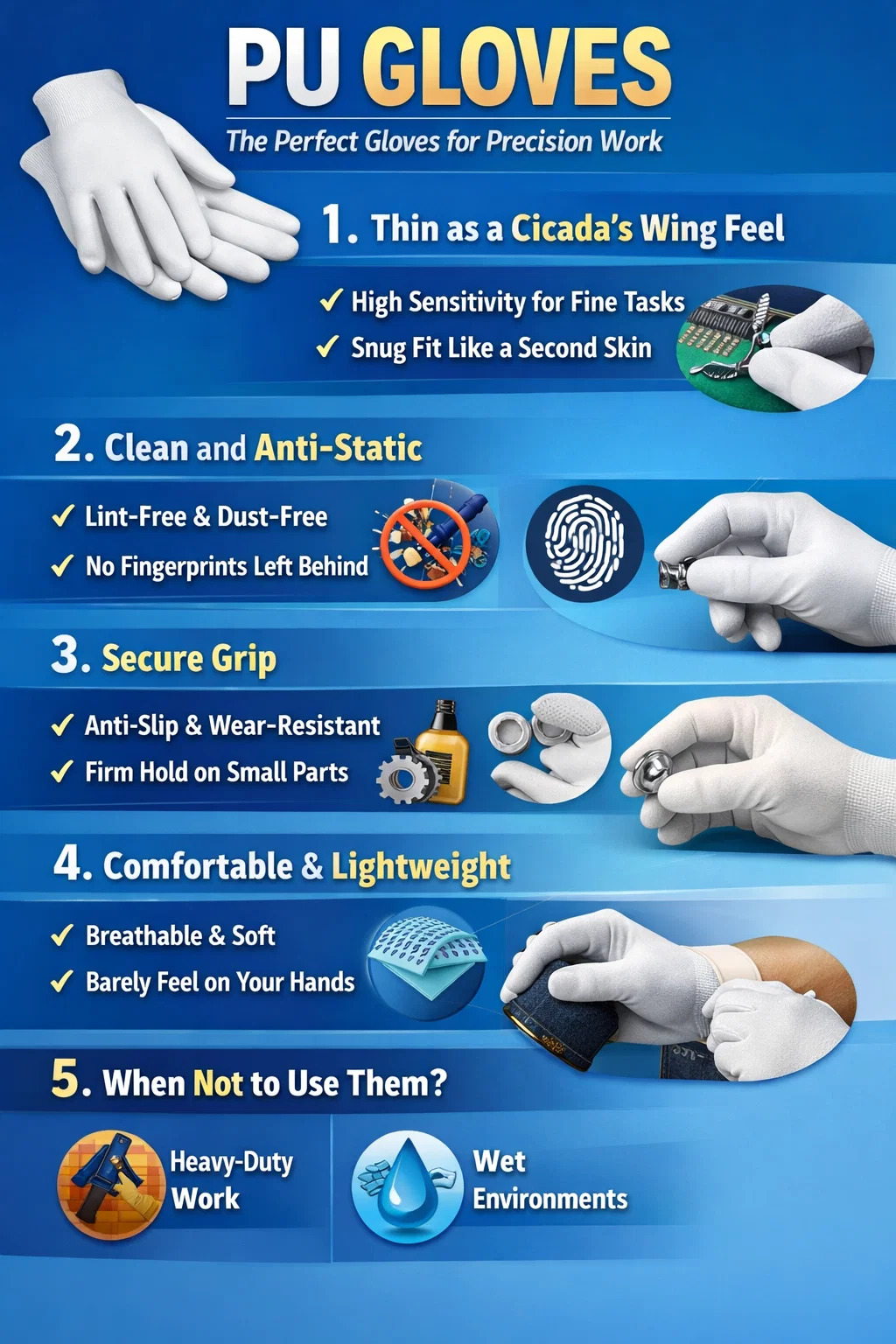 Antystatyczny i bezpyłowy: sam materiał nie jest podatny na generowanie pyłu, co czyni go preferowanym wyborem dla fabryk elektroniki i precyzyjnego montażu instrumentów. Jeśli naprawiasz telefon komórkowy, składasz komputer lub czyścisz drogie obiektywy w domu, noszenie tych rękawic ochronnych ochroni Twoje dłonie, nie brudząc ich części.