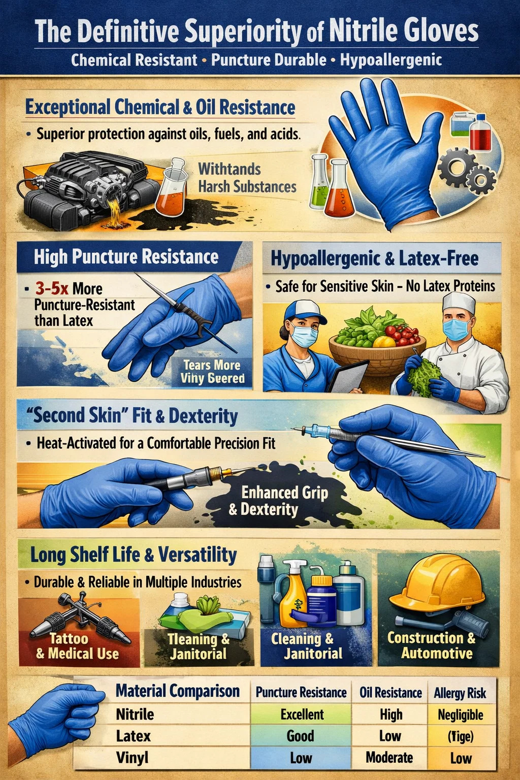 w branża tatuażu preferowany jest czarny nitryl, ponieważ ukrywa plamy atramentu i jest odporny na wazelinę używaną podczas procesu. w prace porządkowe chronią przed środkami czyszczącymi na bazie wybielaczy i amoniaku, które z łatwością przenikają przez tańsze rękawice winylowe. Ta wszechstronność udowadnia, że nitryl to nie tylko kolejna opcja jednorazowego użytku – to specjalistyczne narzędzie zapewniające bezpieczeństwo.