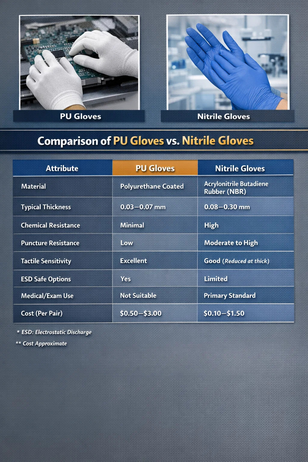 Rękawice PU (poliuretanowe) i rękawice nitrylowe nie są zamienne. Rękawice PU są cienkie, lekkie i przeznaczone głównie do pomieszczeń czystych i obsługi elektroniki, natomiast rękawice nitrylowe zapewniają solidną odporność chemiczną i ochronę przed przebiciem, odpowiednie do zastosowań medycznych, laboratoryjnych i przemysłowych. Wybór niewłaściwego typu nie tylko zmniejsza wydajność — może narazić pracowników na rzeczywiste zagrożenia lub skazić wrażliwe komponenty.