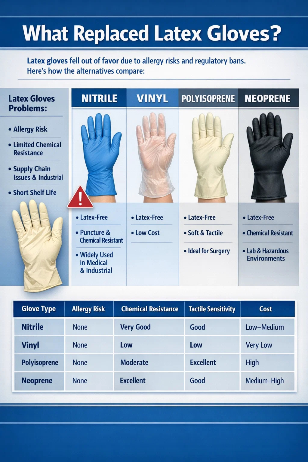 To powiedziawszy, nitryl nie jest jedynym zamiennikiem. Rękawice winylowe, neoprenowe, poliizoprenowe i z polimeru hybrydowego zajmują określone nisze w zależności od zadania, wymaganej wrażliwości, wymagań w zakresie odporności chemicznej i budżetu. W tym artykule szczegółowo omówiono je wszystkie — wyjaśniając, dlaczego nastąpiło odejście od lateksu, jakie są jego alternatywy i jak wybrać odpowiedni do konkretnego przypadku użycia.