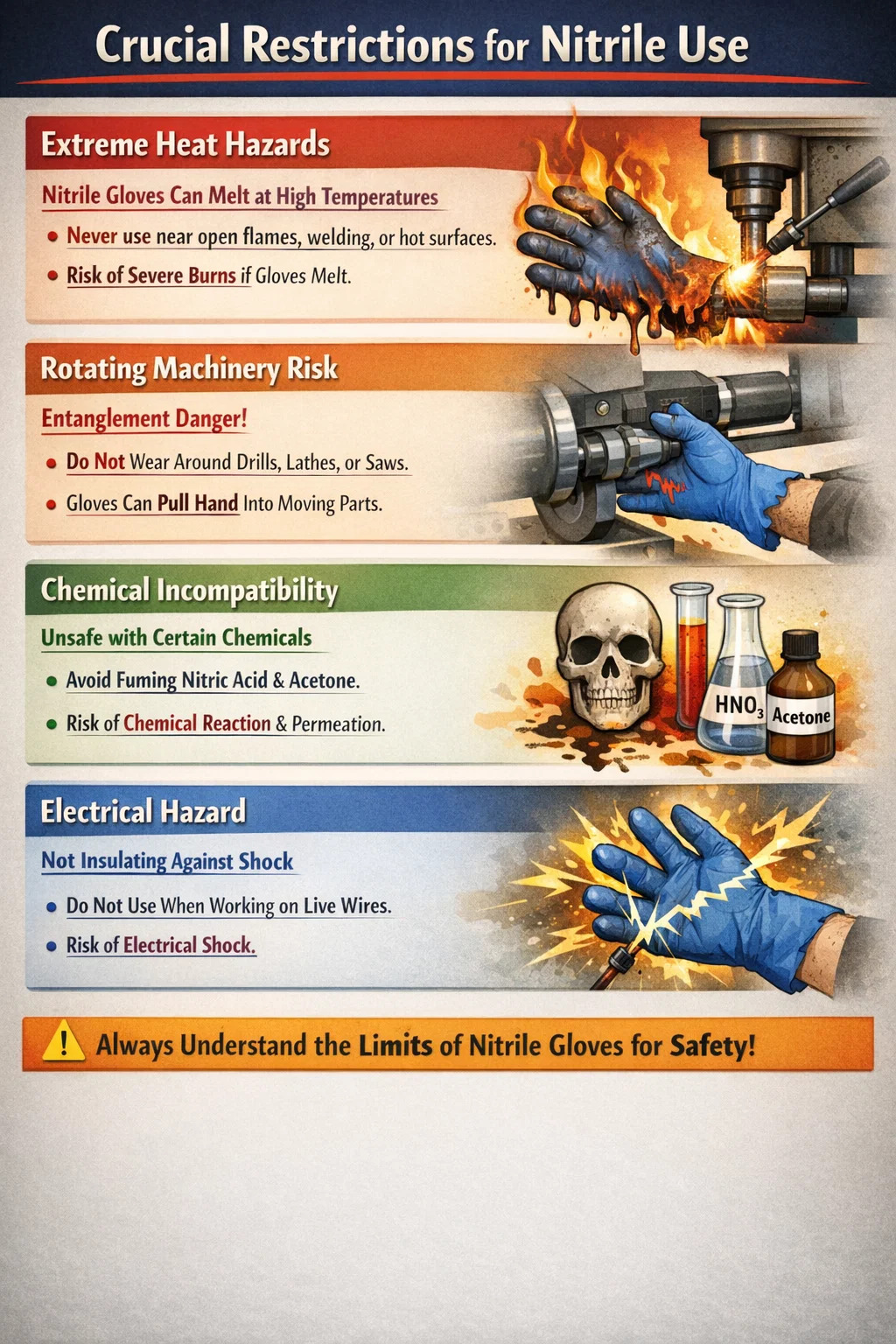 Podczas rękawiczki nitrylowe są złotym standardem w wielu branżach, powinieneś nie należy ich nosić podczas pracy z otwartym płomieniem, obsługi silnie utleniających kwasów lub obsługi maszyn wirujących . Rękawice te są zasadniczo wykonane z tworzywa sztucznego (kauczuku syntetycznego); topnieją i łączą się ze skórą w przypadku wysokiej temperatury i brakuje im siły „odrywania” potrzebnej, aby zapobiec wciągnięciu dłoni przez wirujący silnik lub tokarkę. Zrozumienie tych granic jest niezbędne dla bezpieczeństwa w miejscu pracy.